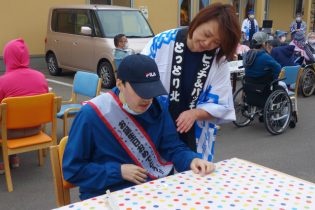 お誕生会の催しはイカサルスタッフ一同によるよさこい踊り。利用者様も掛け声や手拍子で応援します。「感動した」「もっと見たい」との声も頂きました。体力の都合でアンコールにお答えできませんでしたが笑顔が多くみられたレクリェーションとなりました。